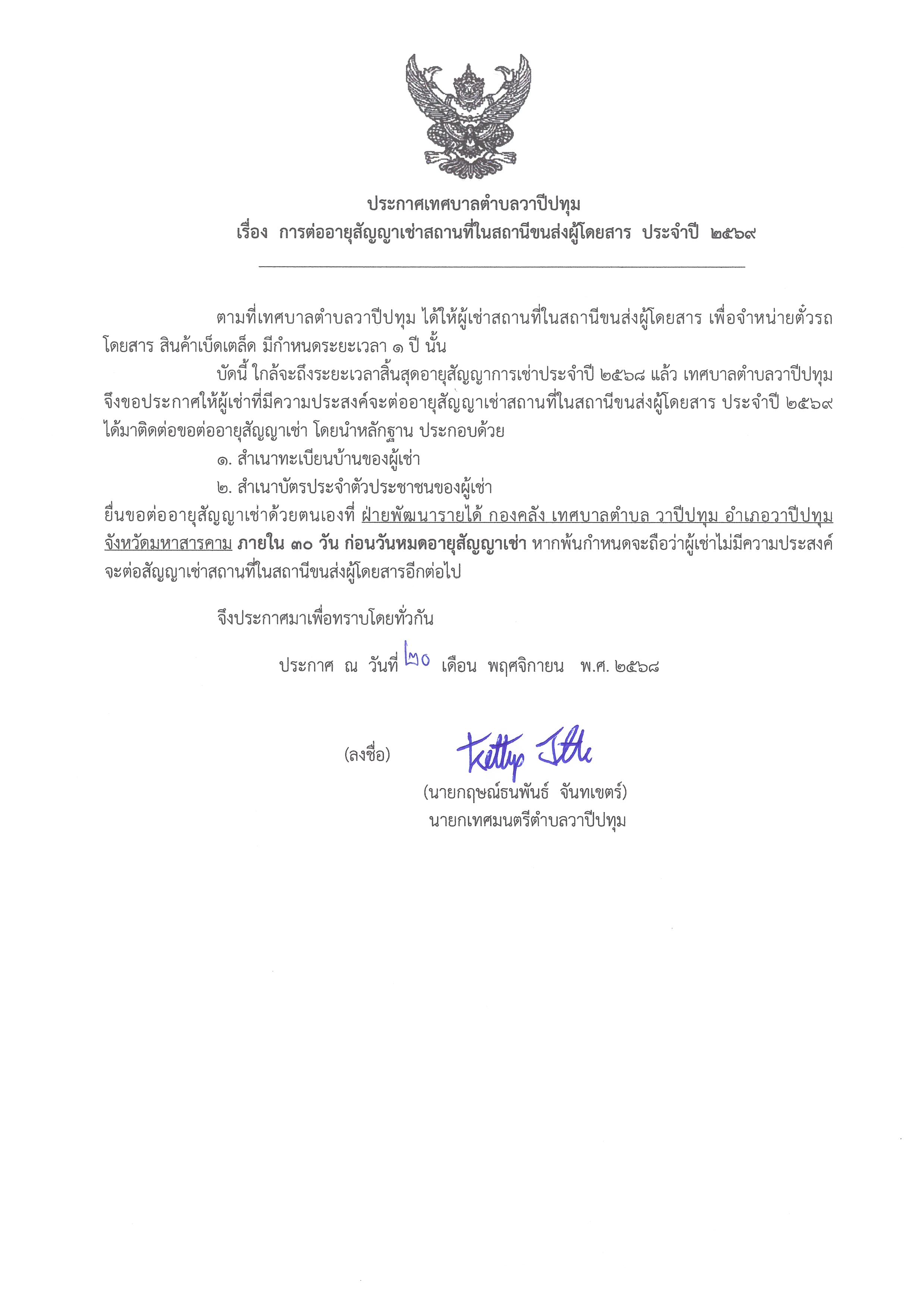 ประกาศเทศบาลตำบลวาปีปทุม เรื่อง การต่ออายุสัญญาเช่าสถานที่ในสถานีขนส่งผู้โดยสาร ประจำปีงบประมาณ พ.ศ.2569 |