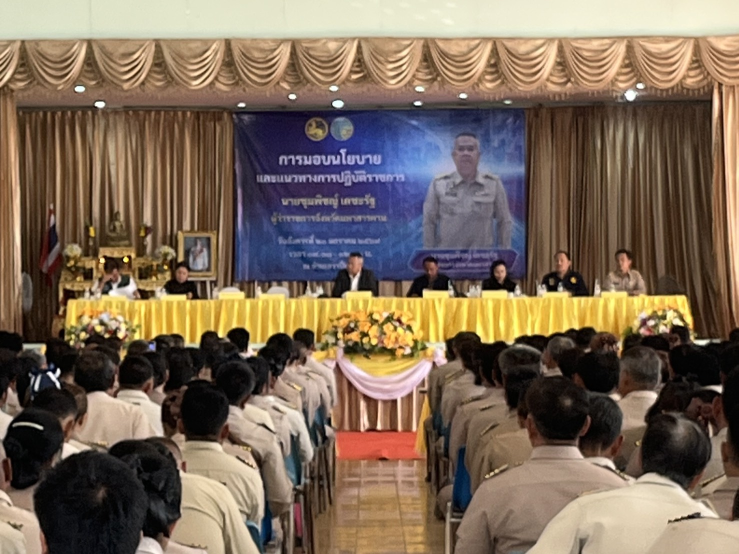 นายกฤษณ์ธนพันธ์ จันทเขตร์ นายกเทศมนตรีตำบลวาปีปทุม มอบหมายให้ นายศุภสิทธิ์ กิตติเสรีบุตร รองนายกเทศมนตรีตำบลวาปีปทุม พร้อมด้วย นายดนตรี อินทร์ไชย ปลัดเทศบาลตำบลวาปีปทุม ร่วมต้อนรับ นายชุมพิชญ์ เดชะรัฐ ผู้ว่าราชการจังหวัดมหาสารคาม พร้อมเข้าร่วมรับมอบ นโยบาย และแนวทางปฏิบัติราชการของผู้ว่าราชการจังหวัดมหาสารคาม ทั้งนี้ เพื่อนำไปสู่การปฏิบัติราชการในพื้นที่ให้ประสบผลสำเร็จ และเกิดประโยชน์สูงสุดแก่ประชาชน โดยมี นายโชคชัย นันตลาด นายอำเภอวาปีปทุม นายสุนทร วงศรีษา ปลัดอำเภอหัวหน้ากลุ่มงานบริหารงานปกครอง หัวหน้าส่วนราชการในพื้นที่ ทุกส่วนราชการ หน่วยงานรัฐวิสาหกิจ สมาชิกสภาองค์การบริหารส่วนจังหวัดมหาสารคาม อำเภอวาปีปทุม ทั้ง 4 เขต กำนัน และผู้ใหญ่บ้านฯลฯ อำเภอวาปีปทุม ร่วมประชุมรับมอบนโยบายดังกล่าว